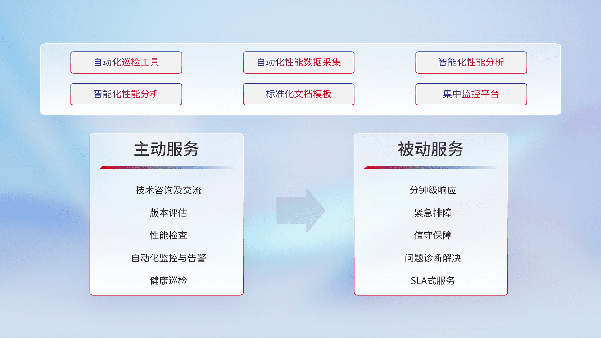 智能化工具和标准化文档,,,,保障服务质量,,提供主动服务(包含技术咨询、、版本评估、、性能检查、、自动化监控与告警、、、健康巡检)和被动服务包含(分钟级响应、、、、紧急排障、、、、值守保障、、、问题诊断解决、、SLA服务)。。。